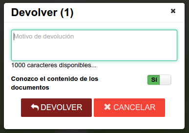 Una vez pulsado el botón devolver la petición será movida a la bandeja de peticiones terminadas con la etiqueta Devuelto, o eliminado del sistema, si así estuviera configurado por el administrador.