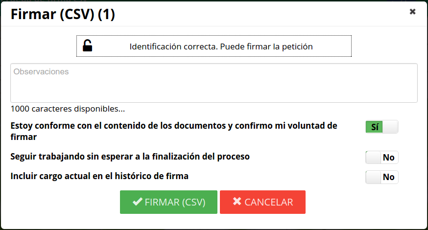 Como se ha comentado en Definición de Firma CSV tradicional se debe tener activa esta posibilidad en administración. Si es así para realizar una firma no criptográfica de una petición basta con seleccionar la(s) petición(es) desde la bandeja de peticiones pendientes y pulsar sobre el botón firmar csv. El botón Firmar y demás opciones sólo aparecerán cuando se haya seleccionado alguna petición en el lugar donde se encuentra la búsqueda.